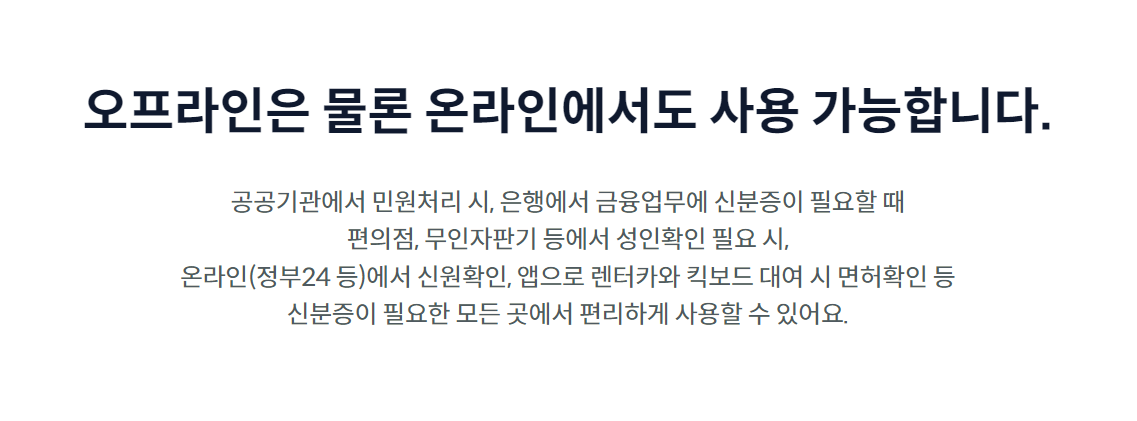 웹사이트에서 나의 신분을 확인시켜 줄 때, 은행에서 금융업무에 신분증이 필요할 때 모두 모바일 신분증으로 사용이 가능합니다.