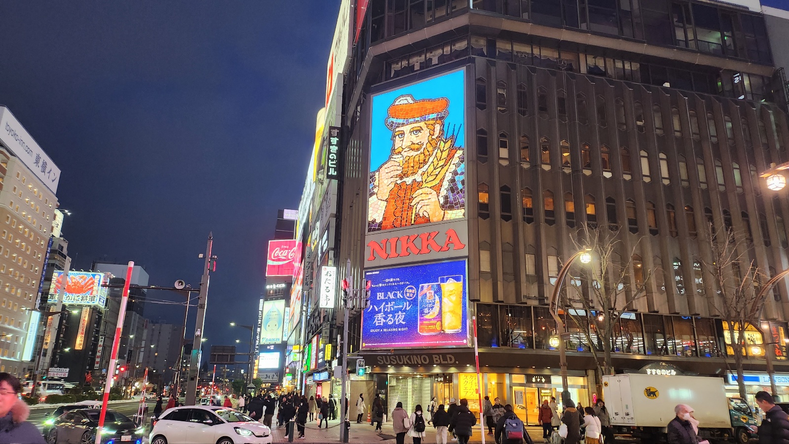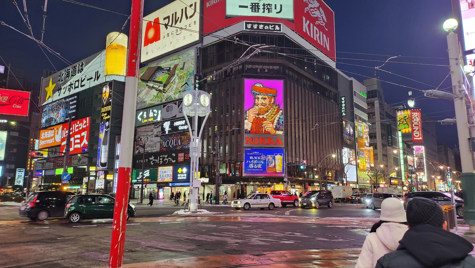 밤이 되면 스스키노 거리가 본격적으로 활기를 띕니다. 화려한 간판, 택시 불빛, 그리고 눈 쌓인 도로까지...