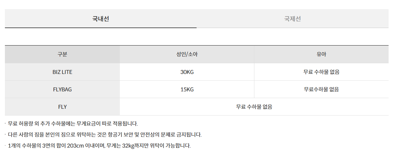 기내 수하물 무게 : 1인당 10kg 미만