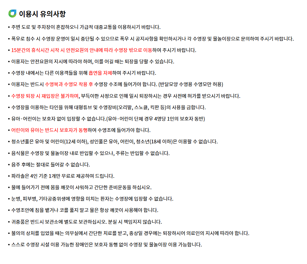 장마나 폭우로 인한 휴장이 될 수 있는 점 양해 바랍니다. 미리 전화나 홈페이지 확인하시어 이동하시기 바랍니다.
